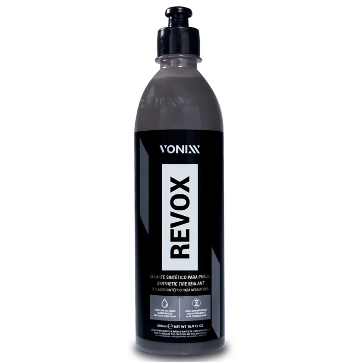 Revox é um selante sintético para pneus, formulado para proteger, dar brilho e renovar o seu aspecto, além de promover total hidrorrepelência. Sua fórmula exclusiva é livre de solventes, ecologicamente correta e não inflamável. Revox é extremamente resistente à lama e chuva, deixando o pneu limpo por mais tempo