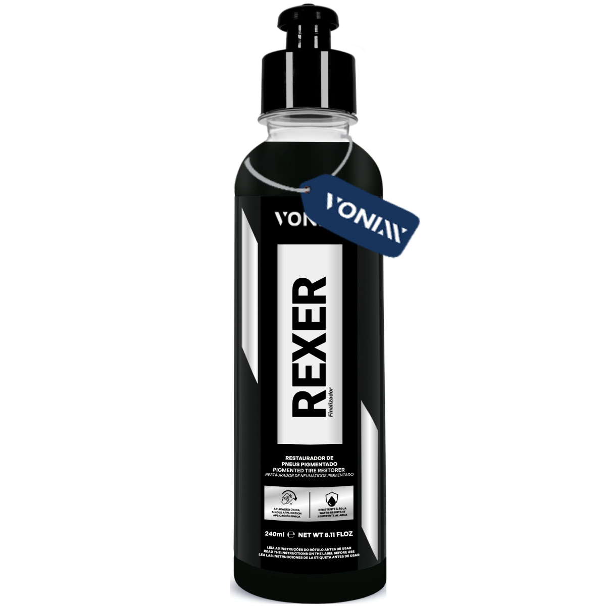 REXER é um restaurador de pneus pigmentado, de alta durabilidade, que forma um filme seco, brilhante e resistente à água em uma única aplicação.